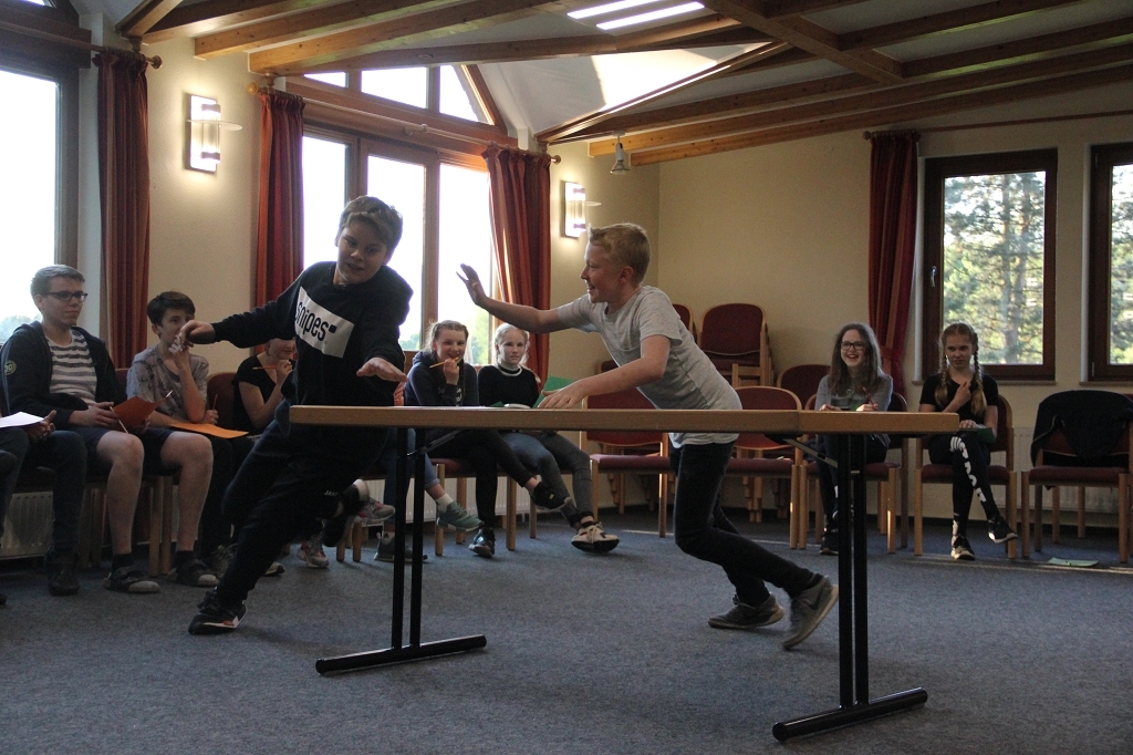 Ideen wurden gesammelt und dann hörten wir einige Stimmen, die etwas über Jesus sagten. Jeder hatte ein anderes Bild von ihm. Nach einer kurzen Pause aßen dann alle gemeinsam, um sich für das Abendprogramm zu stärken. Am Abend spielten die Jungs gegen die Mädchen und es ging um Schnelligkeit, Geschick und Team-Work. Beide Mannschaften schlugen sich gut, aber das Mädchenteam ging als Gewinner hervor.